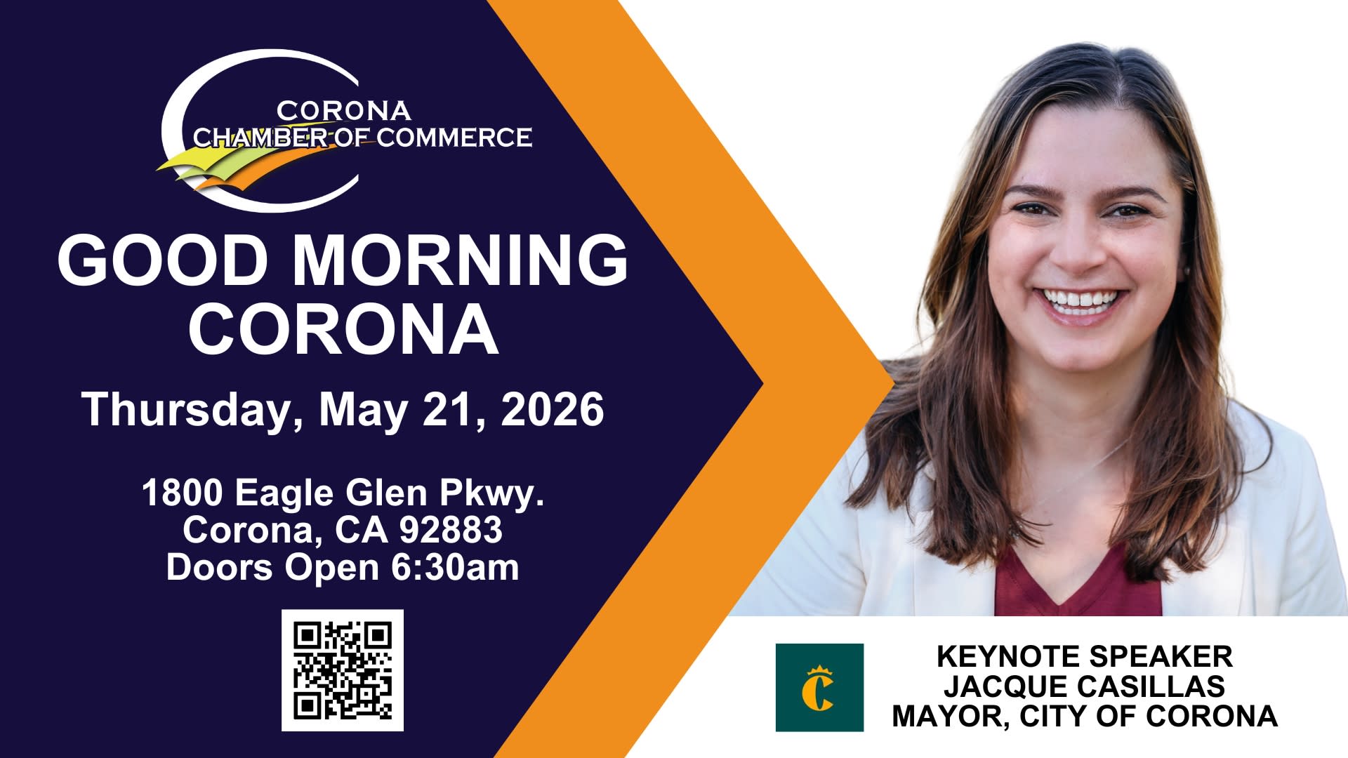 Good Morning Corona brings together the business community for a morning of networking, local updates, and valuable insights. Join us as our featured keynote speaker shares timely updates, discusses current initiatives, and highlights important issues impacting our region. Start your day with connection, knowledge, and community engagement.
