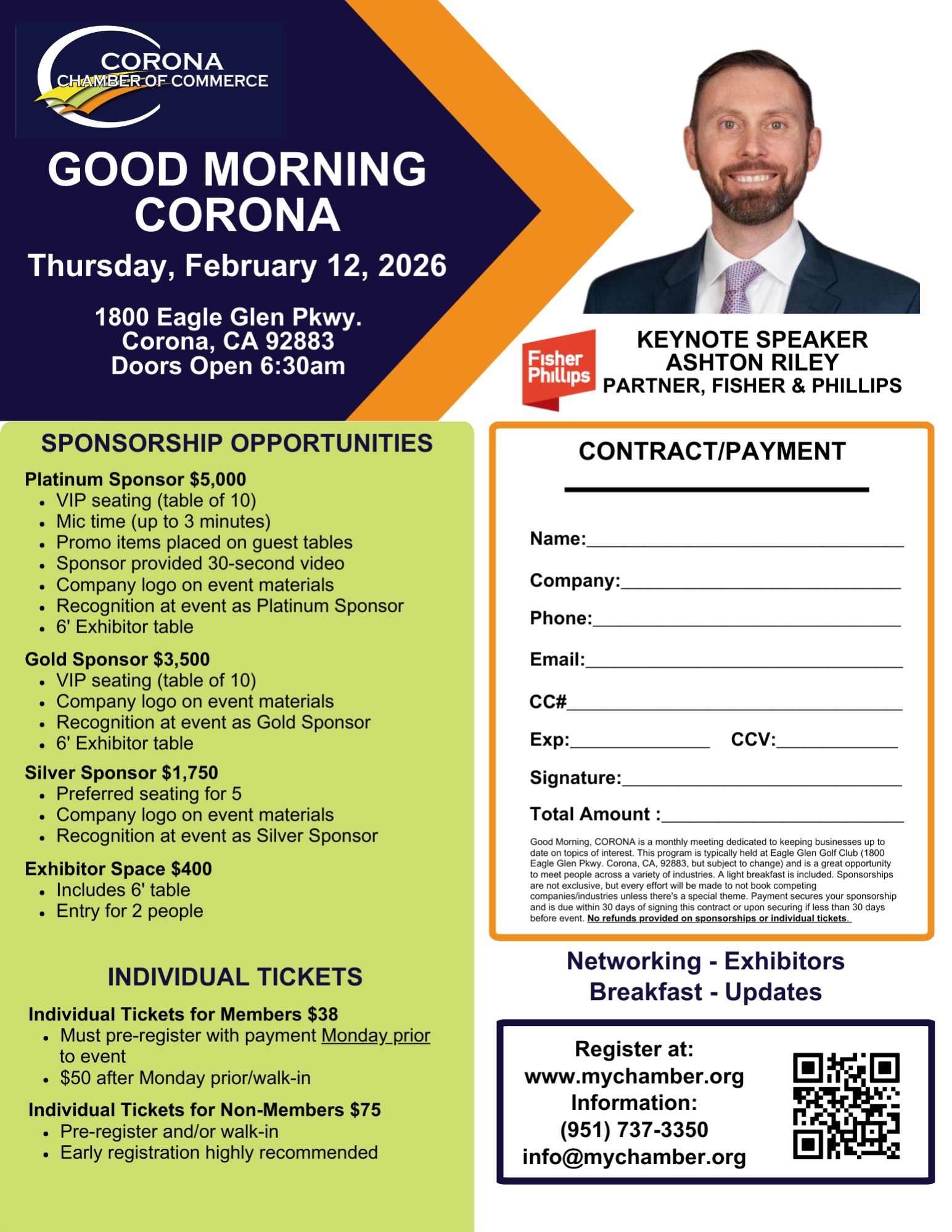 Good Morning Corona brings together the business community for a morning of networking, local updates, and valuable insights. Join us as our featured keynote speaker shares timely updates, discusses current initiatives, and highlights important issues impacting our region. Start your day with connection, knowledge, and community engagement.