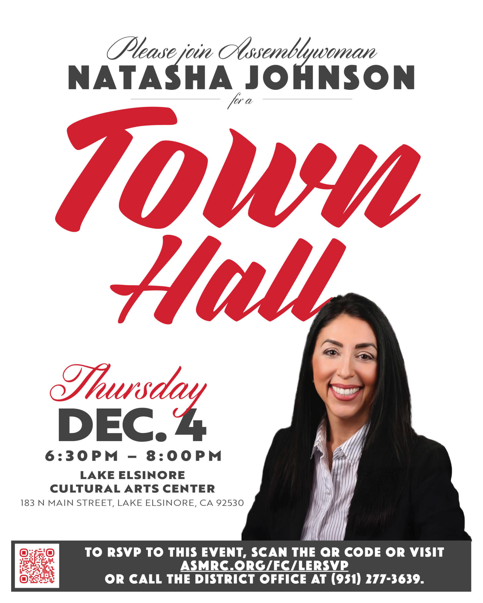 Please join Assemblywoman Natasha Johnson as she address her constituents and community at December's Town Hall. Hope to see you there!